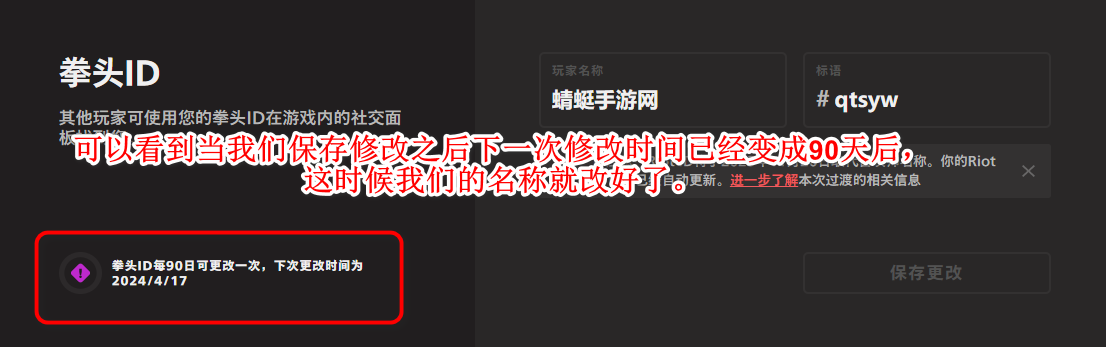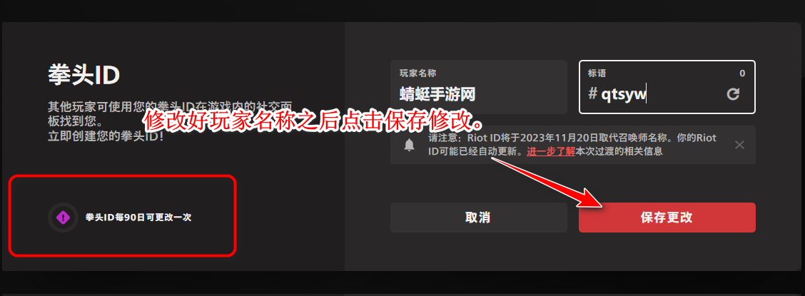 3.进入首页点击修改id名字,可以看到拳头的id在2023年11月20号之后就已经取代召唤师的名字了,所以我们从这里修改名称就会同步到游戏中了。