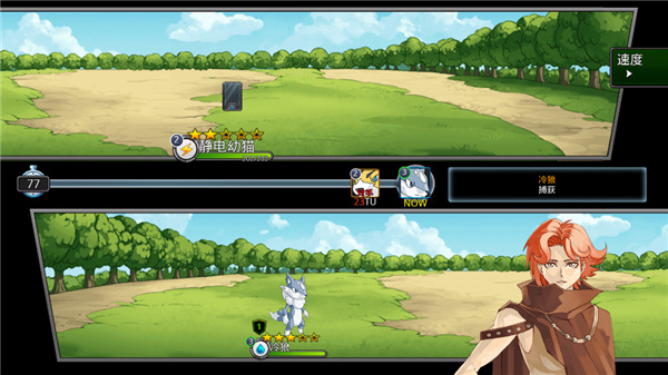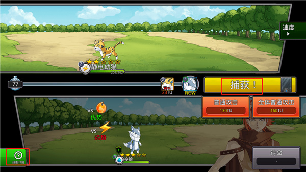 5、继续根据主线,来到森林,碰到静电幼猫的话,点击捕获开启捕获,如果玩家不知道自己搭档怪兽的技能的话,可以点击右下角的技能详情,了解它的基本技能;