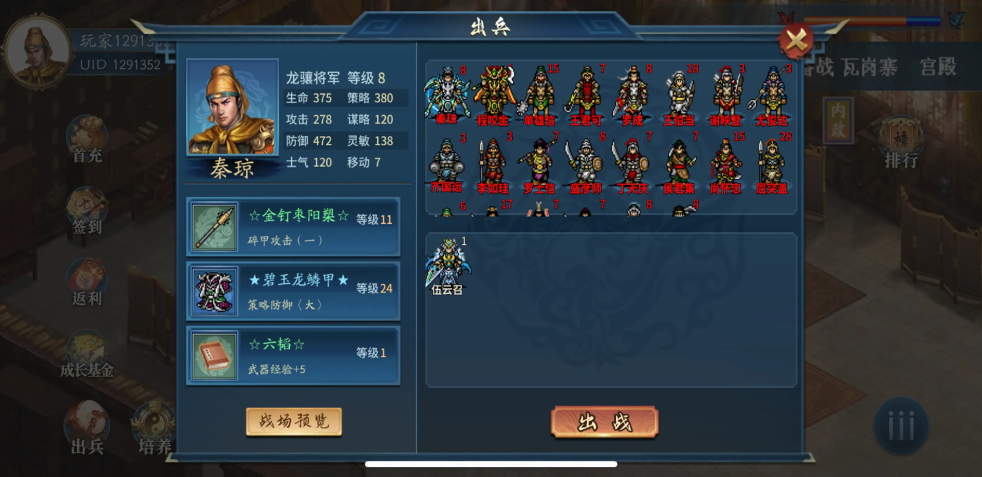 本关有红蓝两个出生点,在红1出生就走赤色数字门路。根据红蓝数字次序进行剿灭营寨,刘武周在6号点。刺客出营寨直接失败,巡逻的步兵只要四周8格没有我方职员就不会触发伏兵。出站前两位随着侯尚进行刺杀,发起选择单体发作亦或清兵人物。其他几个人作为援军在右侧大门外。打死刘武周后盾军出现,敌虎帐寨也会出现敌军。刺杀4人组往右侧大门移动,柴绍与侯对话后触发三军退却剧情,各营寨伏兵出现。三军退却至右侧最终1格过关。柴绍学会神机神算。帮助术数掷中20%。2周目全灭过关嘉奖柴绍发展点,有皮肤再分外嘉奖两点。