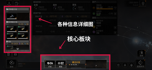 核心板块总共有四个功能板块,点击计划板块可以直接获取当前进行的所有计划详细信息图;点击建造板块,可以获得建筑建设的进度信息图;建立计划是最核心的板块功能,可以建立计划圈,所有的一切行动例如采矿、攻击敌方舰队等都需要构建计划圈,才可以进行行动;最后的板块是地图功能板块,属于缩减小型地图,可以大致观察你现在所在的周遭分布情况。