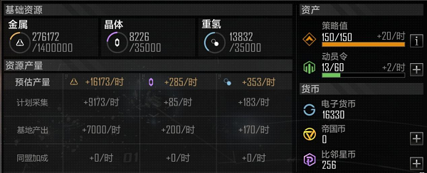 上图就是主界面的资源板块,便于我们直接了解个人的资源使用和产出情况,仓库的上限也可以直接观察到。金属、晶体、重氢属于三大基本资源,日常使用开销极大,经常观察个人资源使用情况,可以帮助玩家进行资源使用规划。