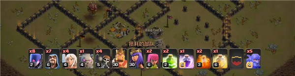 这是一套以野猪为主的流派,但是野猪要等到后期时机成熟才能放,前期主要是靠胖法或者天女进行清理大部分边路建筑,而且这个流派也比较靠援军的蓝胖,如果没有蓝胖,可能效果就没有这么强势了。
