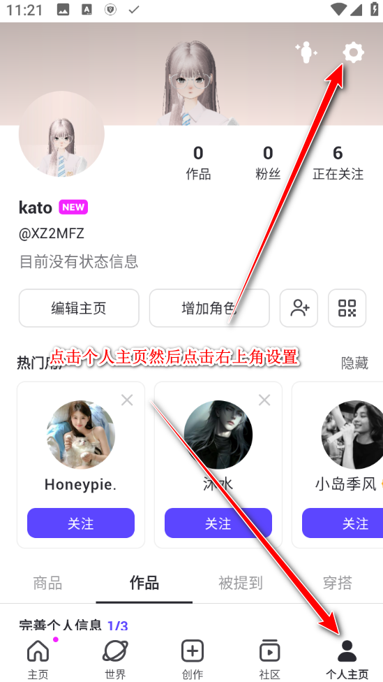1.进入游戏点击右下角个人主页后点击右上角齿轮设置