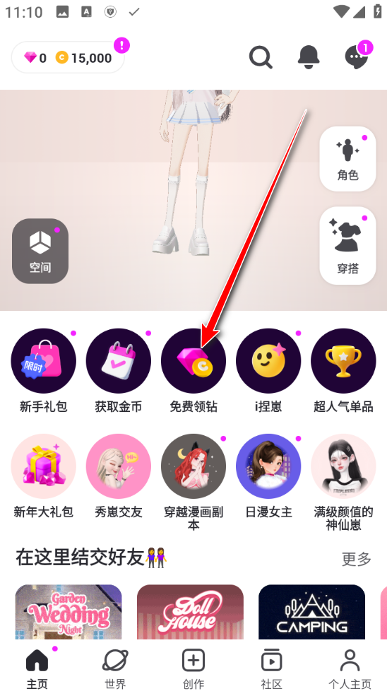 进入游戏之后在游戏首页有一个免费领钻功能