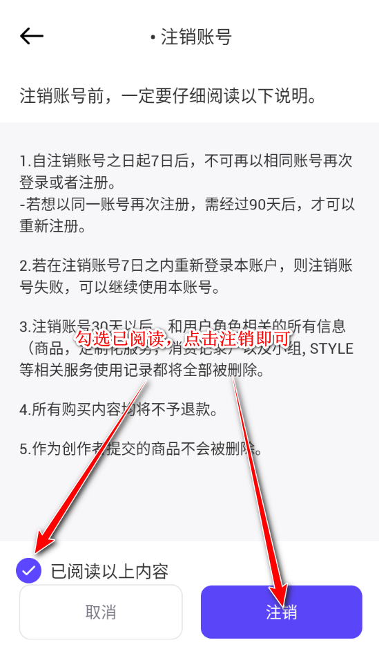 6.勾选已阅读,点击注销即可