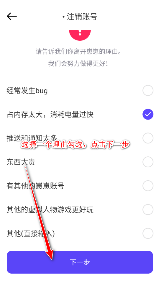 5.选择一个理由勾选,点击下一步
