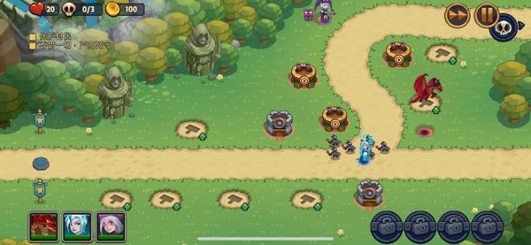 2、开战后,敌人会从带有骷髅标志的路口涌出,奔向带有旗帜的路口,玩家需要合理建造防御塔进行阻击,同时可以派遣英雄到达指定位置攻击敌人。