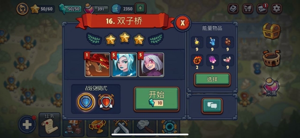 1、游戏中的关卡分为战役模式与传奇模式,通关战役模式后可以挑战传奇模式。战斗最多可以派遣3名英雄,同时可以调整所携带的能量物品道具。