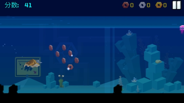 6、水族馆大冒险:通过点击屏幕使角色下潜,控制高度躲避障碍水母。