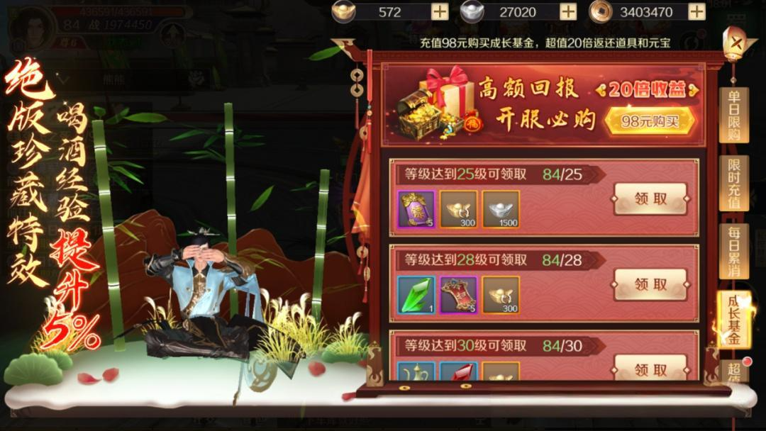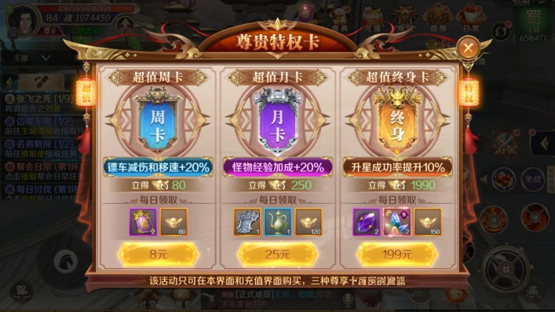 充值:前期充值领先一步,升级做任务都快,推荐月卡和基金都买,加成很多。