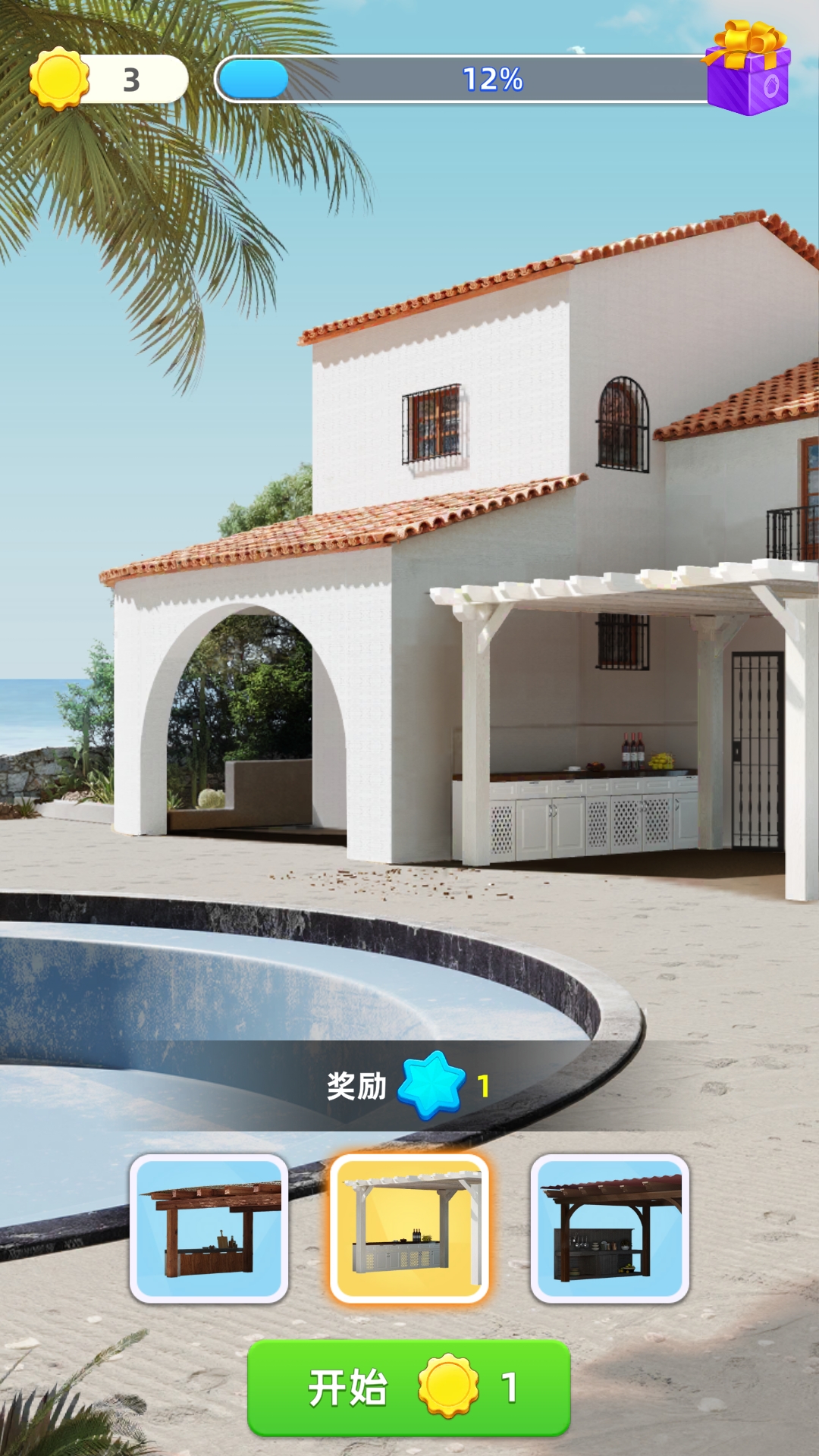8、游戏中还有泳池别墅、客厅、阳台、起居室等丰富的场景等待玩家解锁装修,以上就是快乐合并之家中文版的玩法了。