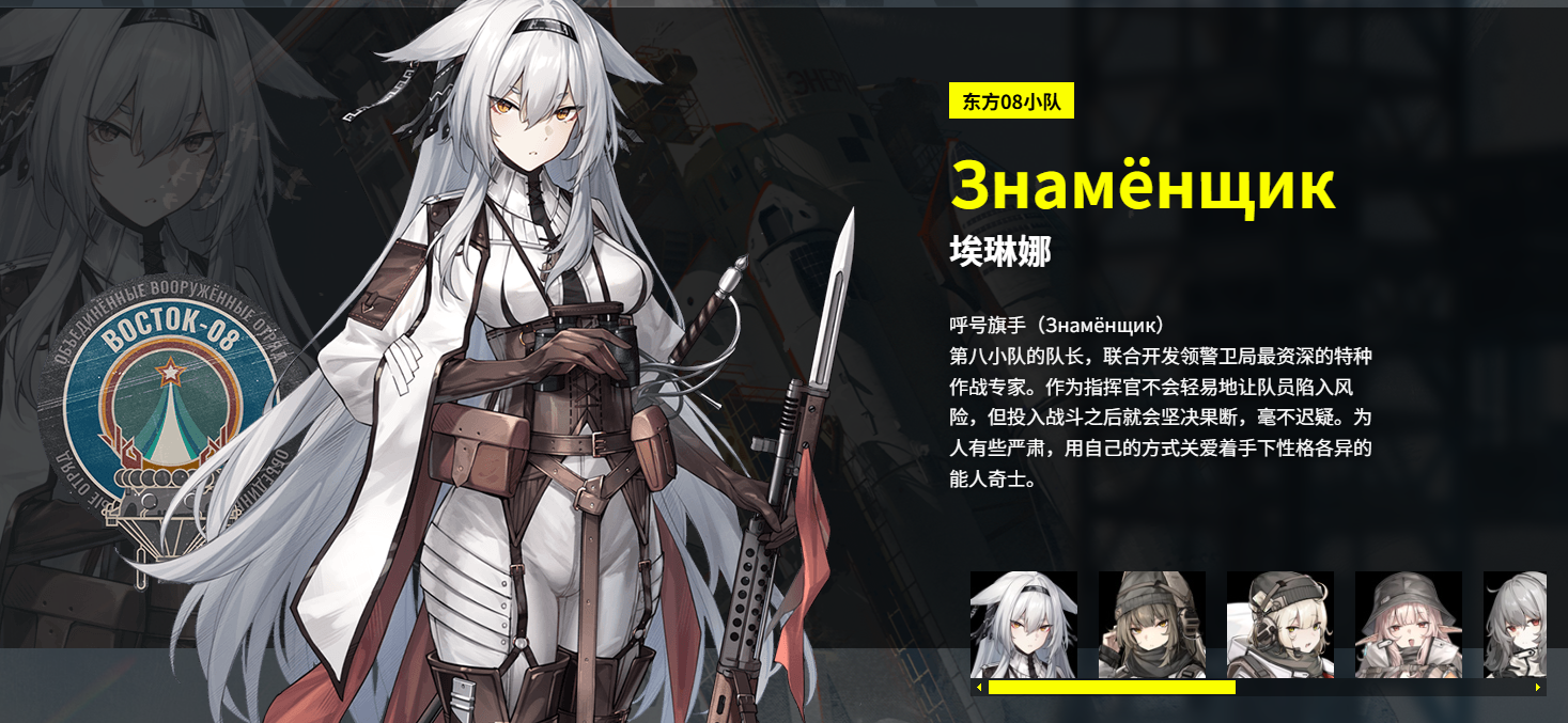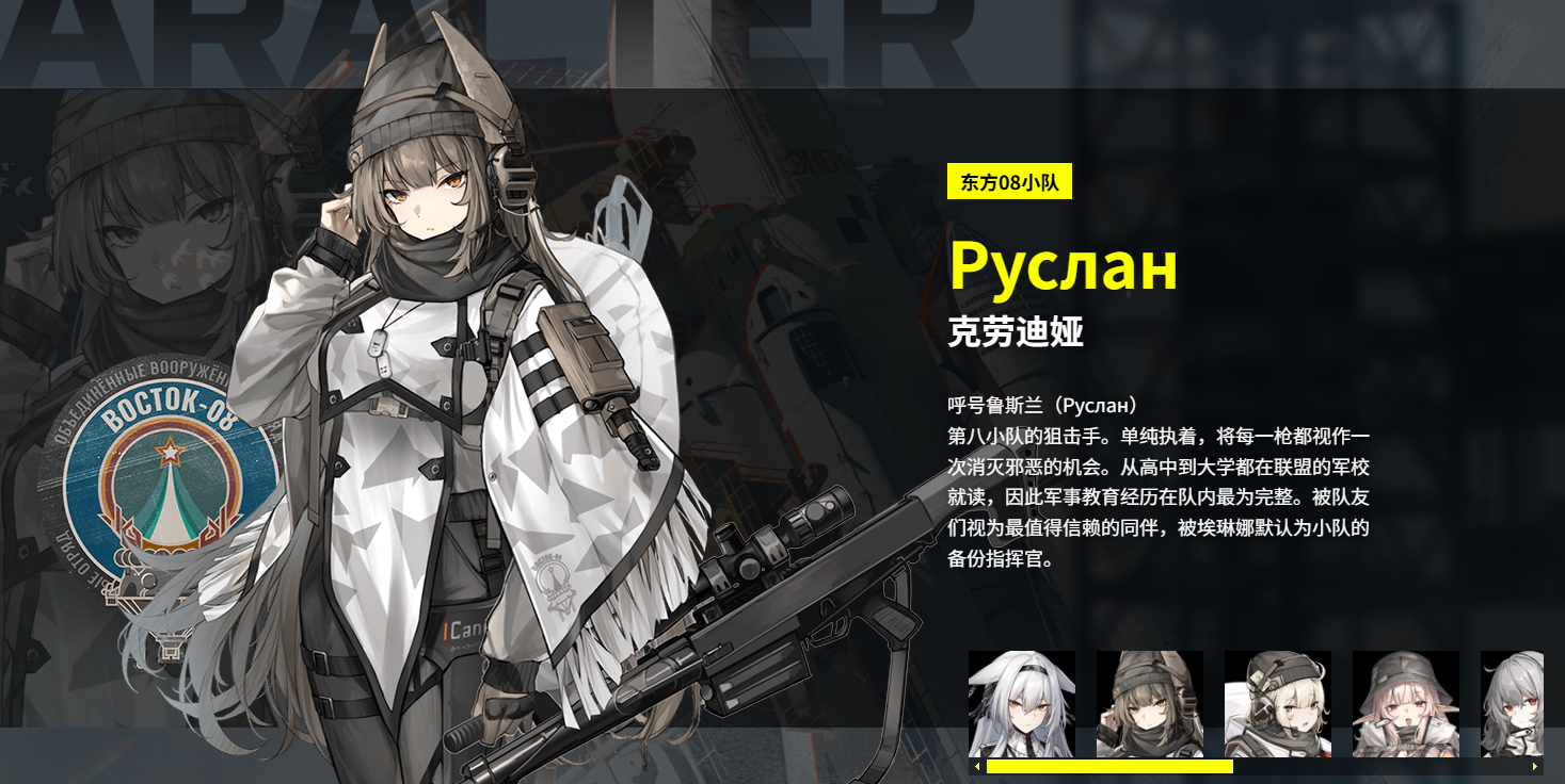 呼号鲁斯兰第八小队的狙击手。单纯执着,将每一枪都视作一次消灭邪恶的机会。从高中到大学都在联盟的军校就读,因此军事教育经历在队内最为完整。被队友们视为最值得信赖的同伴,被埃琳娜默认为小队的备份指挥官。