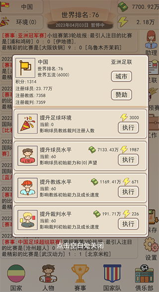足协掌门人是一款文字模拟经营游戏,玩家将扮演一名足球教练,带领中国男足走上世界之巅,游戏中您需要招募有潜力的队员,并针对性的进行训练,提高队员之间的配合度和足球水平,在一场场比赛中提升实力,最终夺得世界冠军。