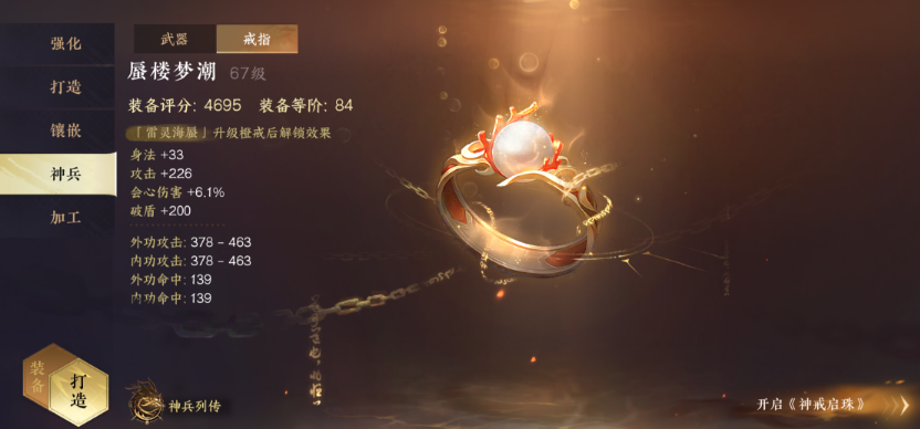 橙戒·蜃楼梦潮现在已经上线打造系统内了,只需要收集一颗海蜃奇珠和二十片天外雷麟,再花费20W交子就可以打造出来了,本期攻略老咸鱼就给大家来简单介绍下橙戒打造材料的获取途径,以及常规进度和最快进度分别什么时候可以解锁。