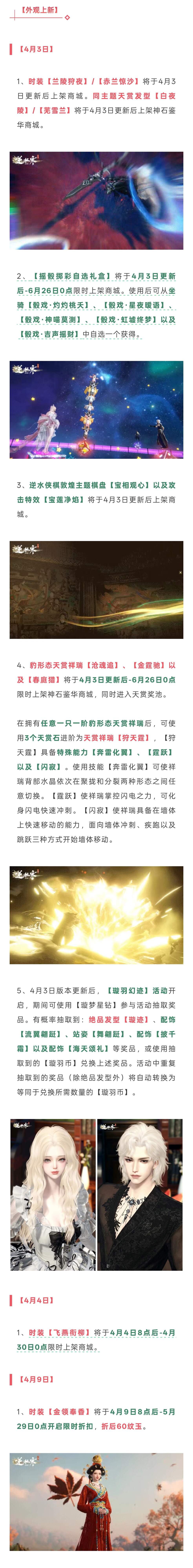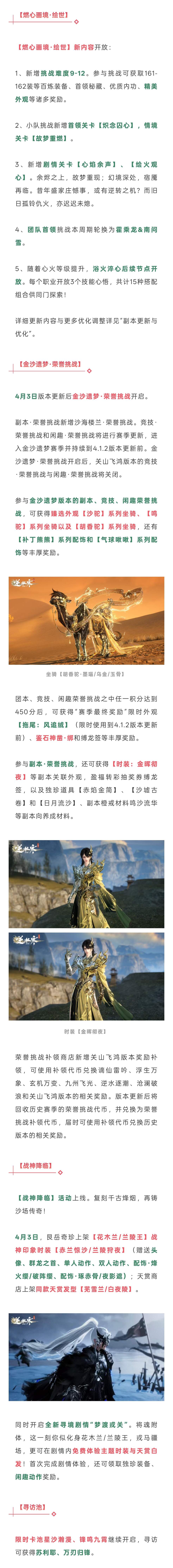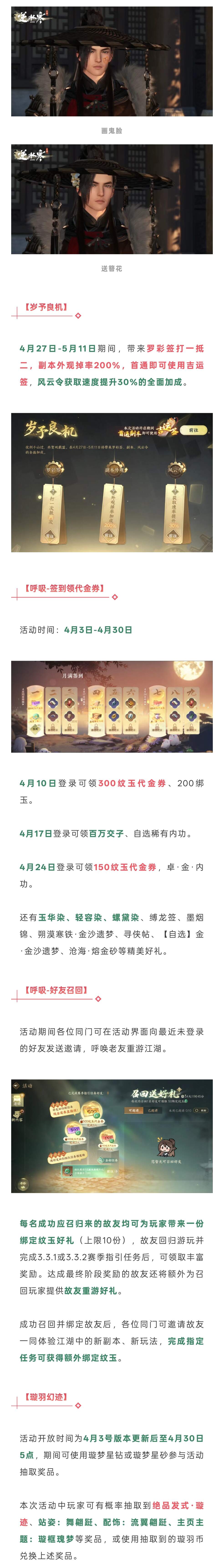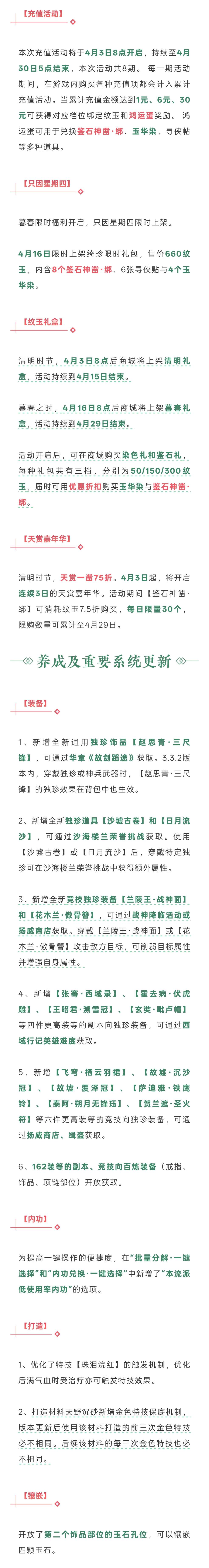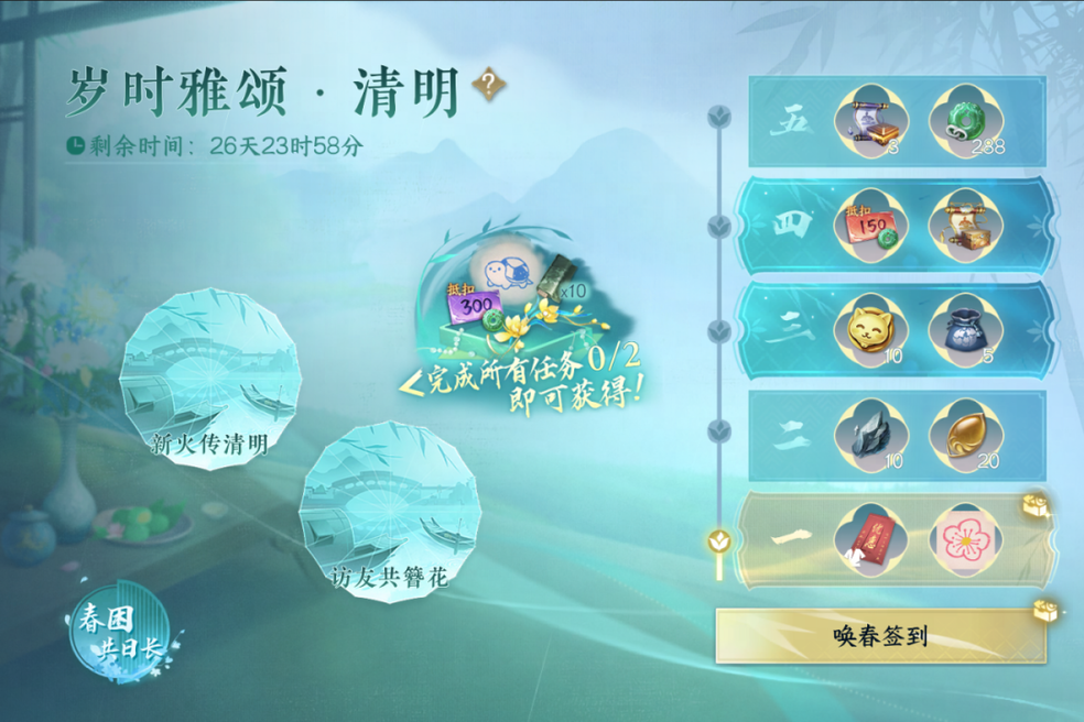 完成活动任务《新火传清明》、《访友共簪花》可获得300纹玉代金券、配饰·兰赋春芳、妆饰·酣眠龟、墨烟锦,更有【自选】优·金·金沙遗梦、朔漠寒铁·金沙遗梦、沧海·熔金砂、绑玉等好礼。
