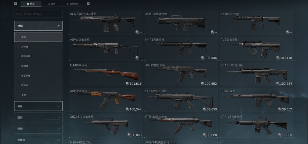 而每个大类下还会细分不同的物品类型,以【枪械】为例,这里会详细区分步枪、冲锋枪、狙击步枪等类别,方便大家快速导航至需要的类目