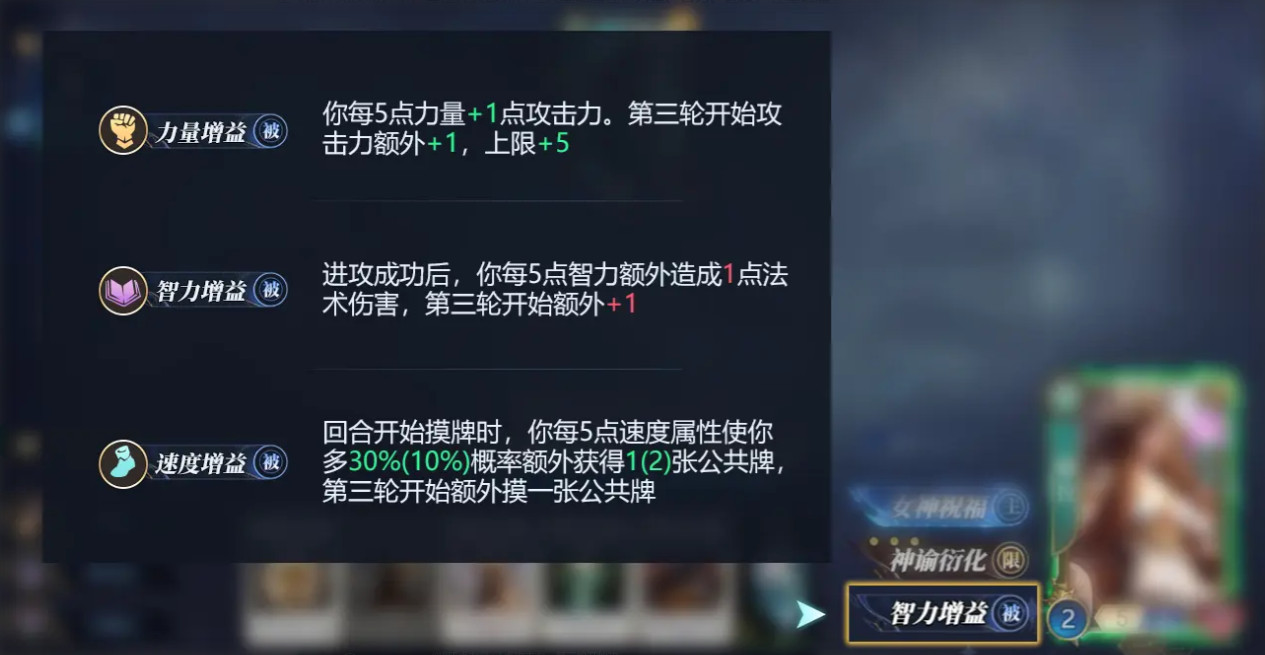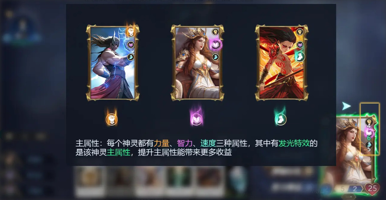 2.根据主属性,神灵会获得相应的【属性增益】技能,三种属性的增益方向各不相同。力量增益可以提升神灵的攻击力;智力增益可以加强神灵的法术输出;速度增益可以摸更多的牌。这些属性增益技能将在游戏进行到第三回合时得到进一步强化,加快游戏节奏。