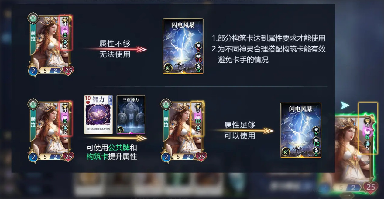 3.许多构筑卡牌都对神灵的属性值有一定要求, 只有满足了这些要求,才能激活构筑卡的强大效果!