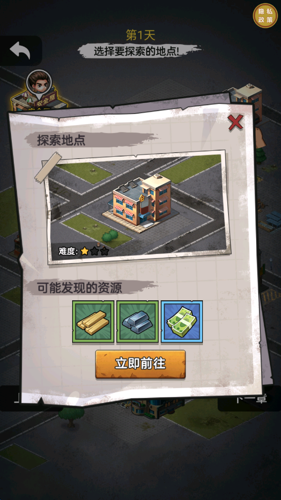 3.进入“第一天求生”任务后,点击【探索】按钮即可外出行动,在废墟中搜集食物与武器,提升战斗力以抵御丧尸袭击。
