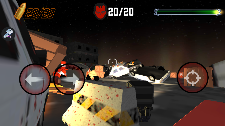 通过左侧左右箭头按钮控制移动,躲避僵尸的同时,利用右侧瞄准射击按钮攻击僵尸,