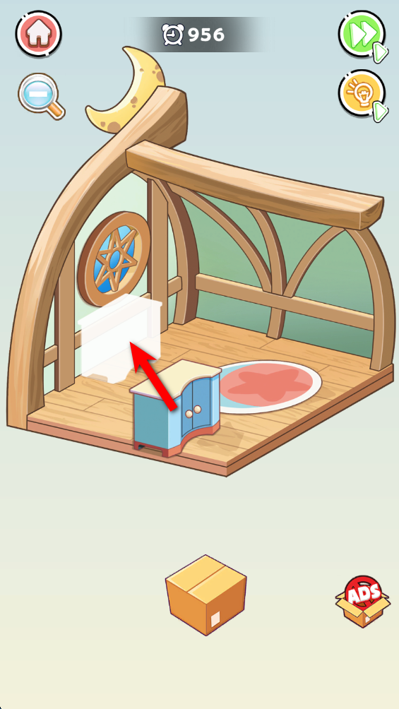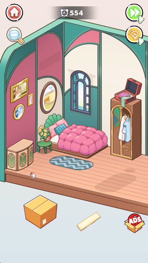 1.进入关卡后,点击房间里的神秘箱子,各种家具和物品就会随机出现。