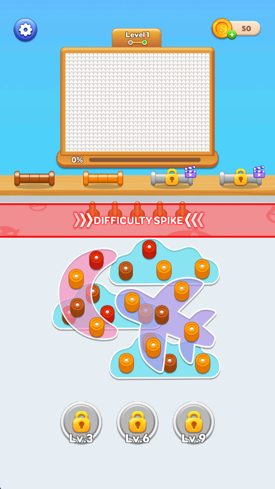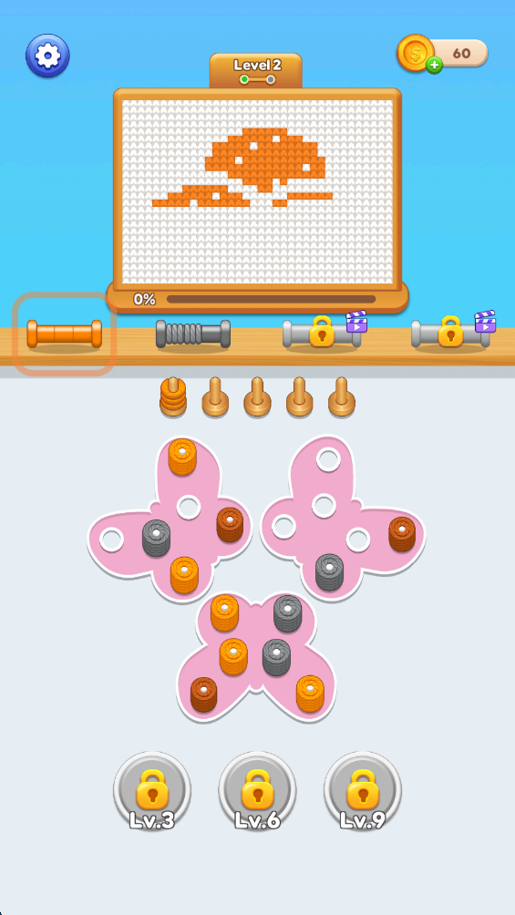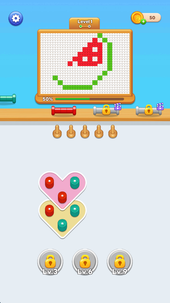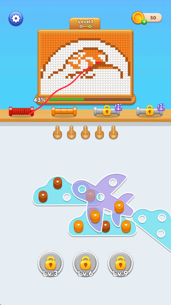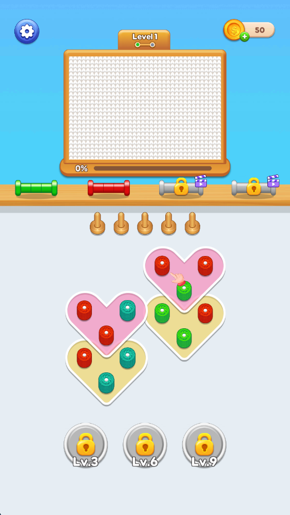 1.通过滑动屏幕匹配三个相同颜色的毛线球,连接后毛线会自动消除并释放缠绕的螺丝钉。