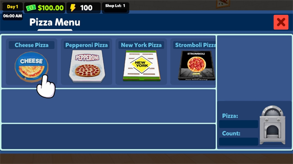 2.先去购买制作披萨的原材料再去点击制作好,就可以移动角色摆放到货架中,合理自定义价格等待顾客前来消费,完成订单任务。