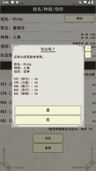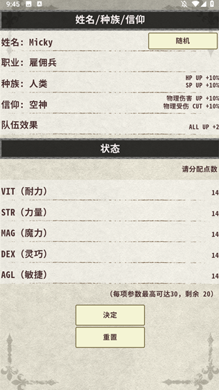 2、设置好语言后点击屏幕中的TOUCH TO START即可进入游戏,游戏内还有这内置菜单,玩家可以自由的决定每一个人物的耐力,力量,魔力,灵巧等等;
