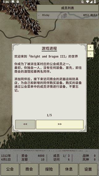 3、玩家可以在斯科格村中进行战斗,公会,商会,探险,休息,设置等等,公会内玩家可以常规人物确认,成员确认,队伍编组;