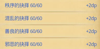 地图中大部分事件的选项有染色:绿色:秩序 + 1,上方指针左移1格红色:混乱 + 1,上方指针右移1格浅蓝:善良 + 1,下方指针左移1格深蓝:邪恶 + 1,下方指针右移1格
