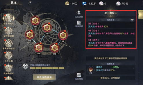 而流派效果必须要根据镶嵌的铭文数量来激活2/4/6件套的不同效果哦~~当然,如果你的铭文品质不同,但又凑成了一套,系统会按照最低品质提供套装效果的,妈妈再也不用担心我浪费铭文啦!