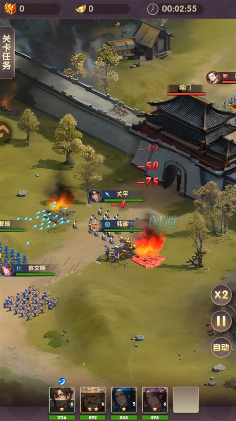 点击战场右下方的自动按钮后,将开启自动战斗,所有武将将自动索敌进行战斗,并在战意值满之后自动释放技能。