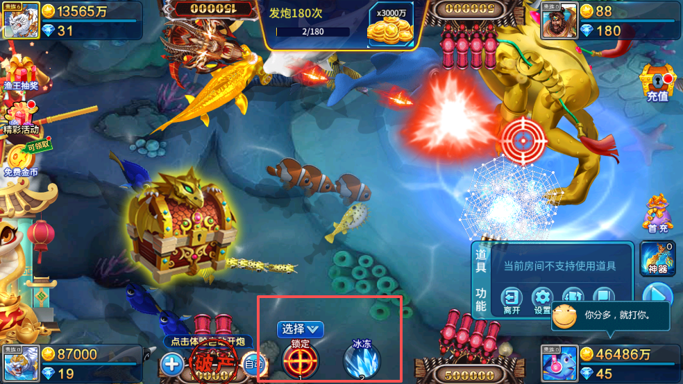 1.进入房间后,点击炮台开始捕鱼