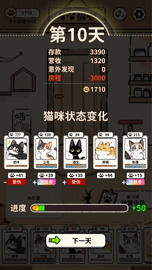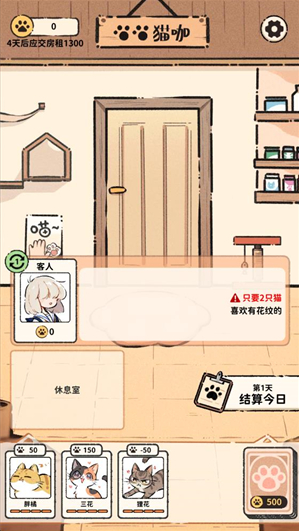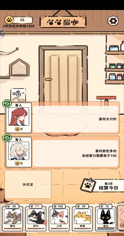 4、点击结算今日后可以完成顾客的订单获得猫猫币,每隔一段时间需要上缴一定的房租来完成任务,并且每完成一个订单猫猫们都会减少一点精力。