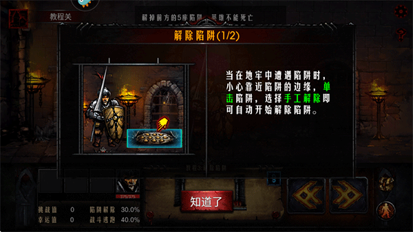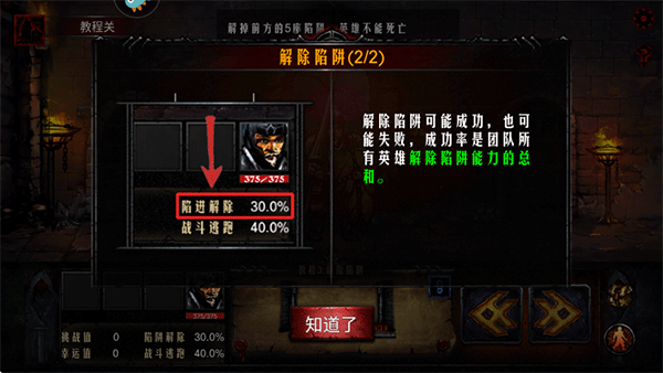 4、当在地牢中边遇陷阱时小心靠近陷阱的边缘,单击陷阱,选择手工解除即可自动开始解除陷阱。解除陷阱可能成功,也可能失败,成功率是团队所有英雄解除陷阱能力的总和;