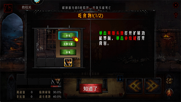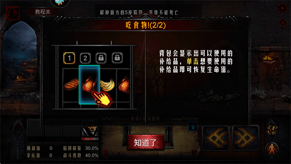 进入地牢后如果看到这样的动物尸体,选择回复60%生命是比较划算的,如果后期食物比较多可以选择给6个食物回复全体100%生命,如果目前都没有损血,那可以选择离开,等需要的时候再来吃。