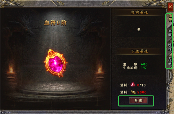 玩家可以为血符、玄甲、魂珠、龙戒等装备升级、每个装备对应的属性都不同,玩家可以针对性进行升级。