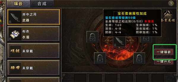 可以为武器、服装镶嵌上宝石,宝石套装满级后可以激活属性加成。
