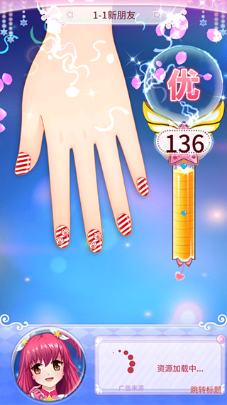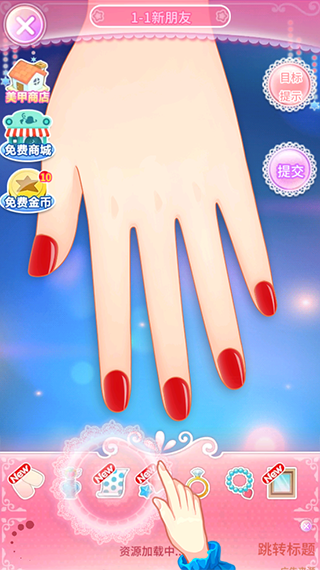 3.“魔法美甲2”中,装扮主要包括“指甲”、“指甲油”、“花纹贴”、“钻饰”、“戒指”、“腕饰”以及“背景”共7个部分,装扮顺序与生活中的真实的美甲一直。其中“指甲”、“指甲油”与“花纹贴”一代美甲差别不大,我们只需要按着相应的目标,换上合适的形状与颜色就行了。