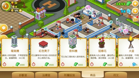 2.在《逗趣医院》中,比医院建造和医生招募更重要的是患者的体验,于是这款游戏中的附属设施就显得十分重要啦,空荡荡的医院感觉冷?