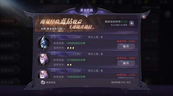 黄金挂机是核心玩法之一,每日通过完成各类活动获取“黄金挂机时间”,根据自身等级和防御力使用“黄金挂机时间”去适合的黄金挂机房点位挂机。黄金挂机房会产出大量的经验、装备和蓝钻宝石,等级和战斗力越高获取的收益就越多。