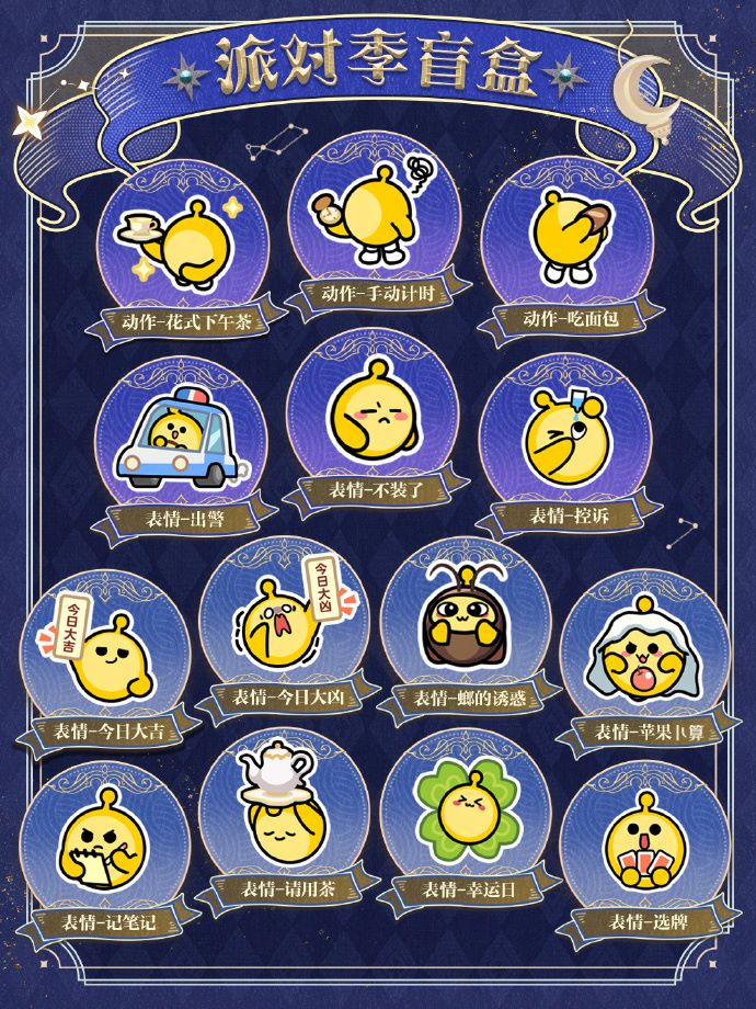 “织梦寻星季”派对季开启后,游戏将根据蛋位继承规则对玩家蛋位进行降级继承。与此同时,新派对季的开启也带来了新的蛋位任务,完成指定任务,即可领取外观“忧郁茄子”、 “小城邮差套装”,配饰“昨日明信片”,及“繁星之夜头像框”等丰厚奖励!铁蛋五项奖励同步开启,可获得“梅花枝头像框”。
